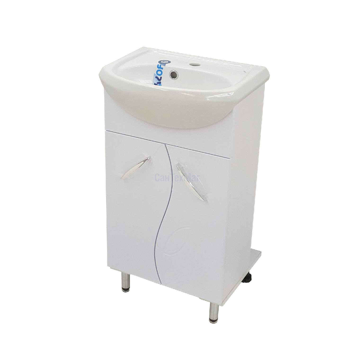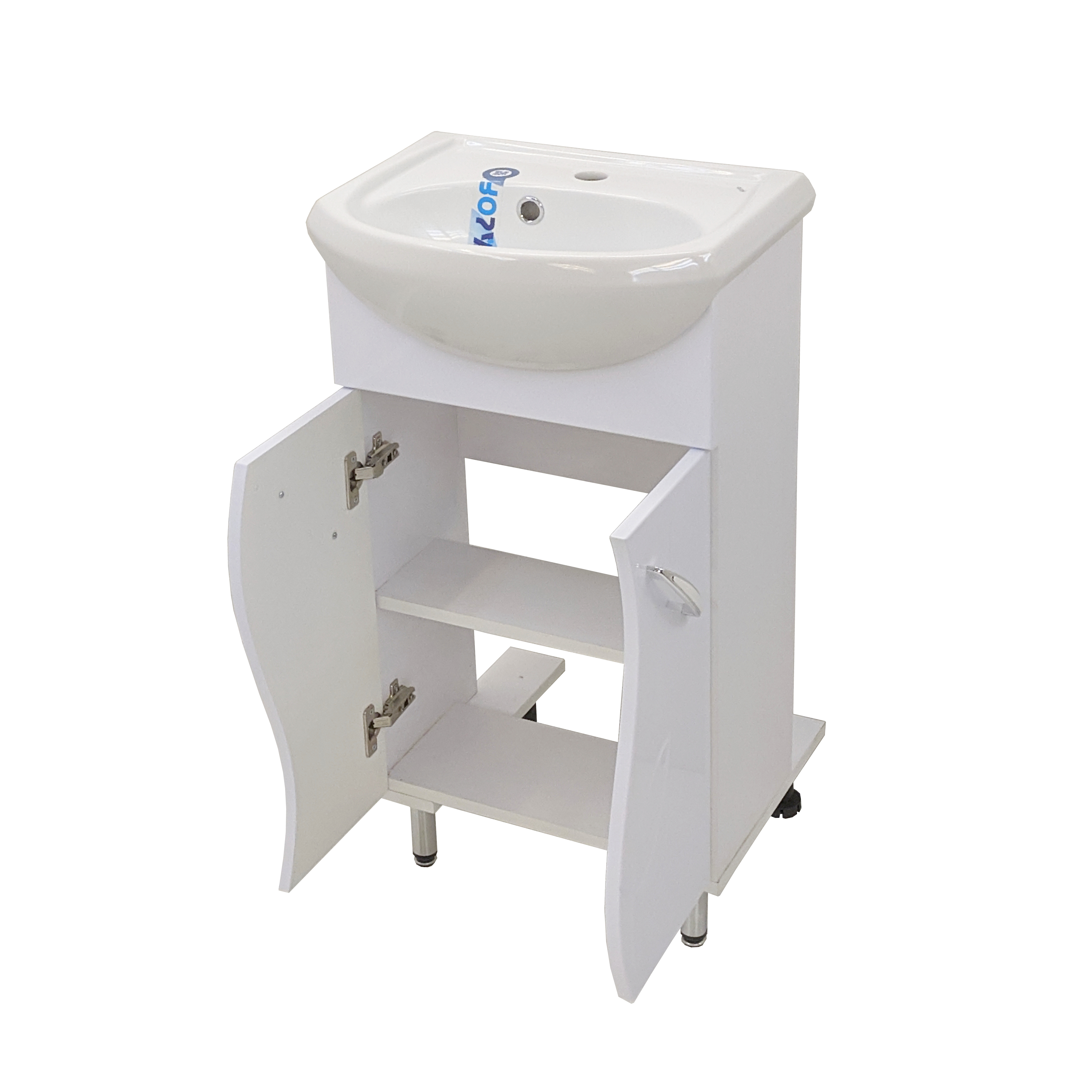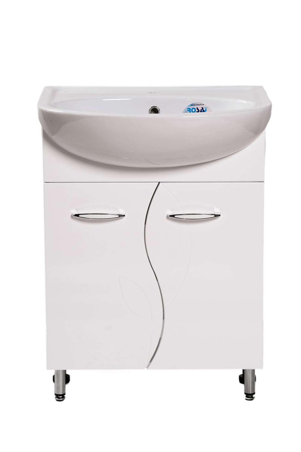 Классическая напольная тумба для ванной комнаты с раковиной полукруглой формы с переливом. Внутри 2 вместительные полки для ванных принадлежностей, средств гигиены. За дизайн отвечают волнообразные края дверей, декорированные ручки. Фасад из МДФ.