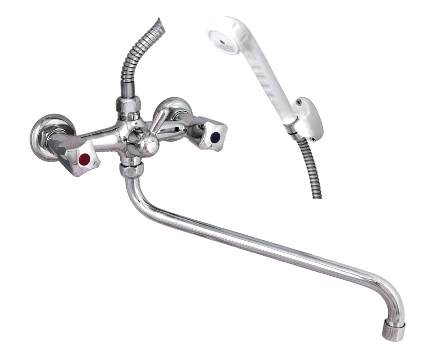 Смешивание и подача горячей и холодной воды происходит с помощью пластиковых хромированных маховиков Кватра с керамическими кран-буксами, смена режима подачи воды излив/лейка с помощью переключателя с керамическими пластинами, длина излива 300-320 мм, длина душевого шланга 1,5 м.